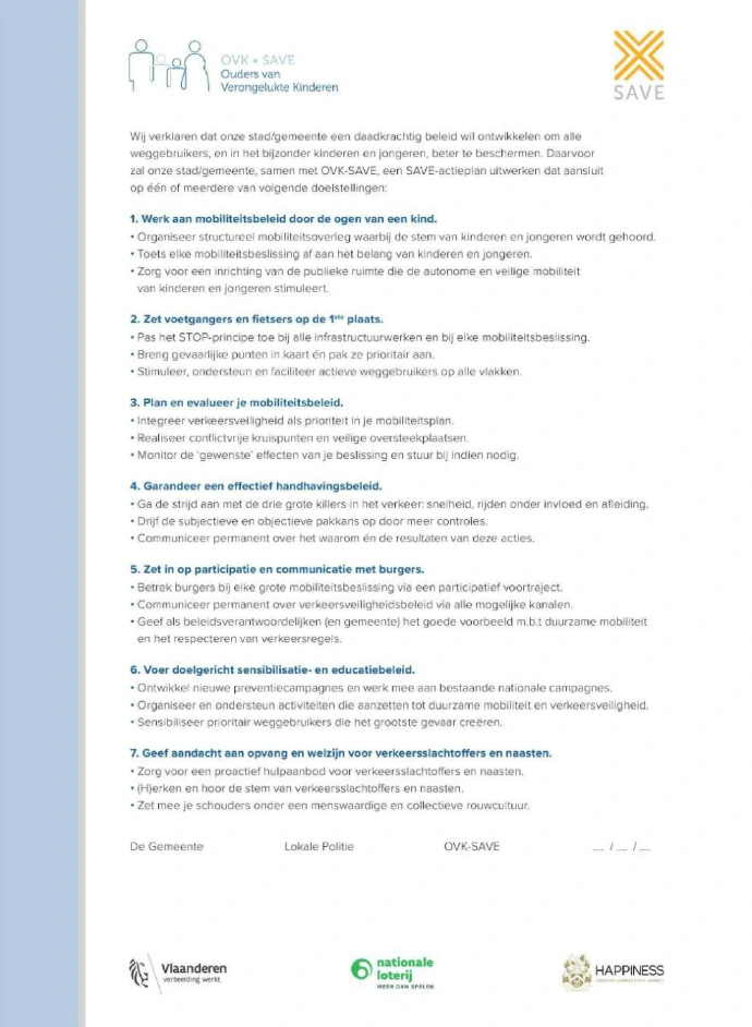 Het eerste charter bestaat al sinds 1995. Sinds 2011 was er een SAVE-charter voor steden en gemeenten. Al meer dan 150 gemeenten hebben dat ondertekend. “Omdat zij dicht bij hun burgers staan hebben zij een grote impact”, zegt projectcoördinator en deskundige verkeersveiligheid Roel De Cleen.